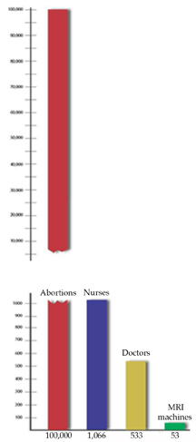 The $80 million annual national bill and $30 million Ontario bill is a conservative estimate and even then it fails to take into consideration the costs for complications which can be substantial. But there is another way the dollar figure fails to capture the costs of abortion. CLCY has a YouTube video promoting the Defund Abortion Rally and they point out the opportunity cost of wasting $30 million annually on abortion. Opportunity cost is what is given up by buying something. In Ontario, they note, $30 million could pay for 200 family physicians, 400 nurses, or 20 MRI machines. Extrapolating nationally, the choice is between funding for 100,000 abortions, or 1066 nurses, 533 doctors, or 53 MRI machines. At a time when 4.1 million Canadians are without a family doctor and waiting times for diagnostic imaging exceed the medically recommended time frame for care, $30 million each year could be redirected to more pressing health care needs.